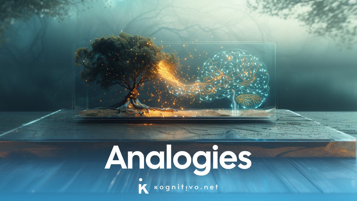 Analogies are cognitive shortcuts that help grasp new ideas using the mental models we already have. They let the brain recognize familiar relationships in unfamiliar territory, fostering knowledge transfer.