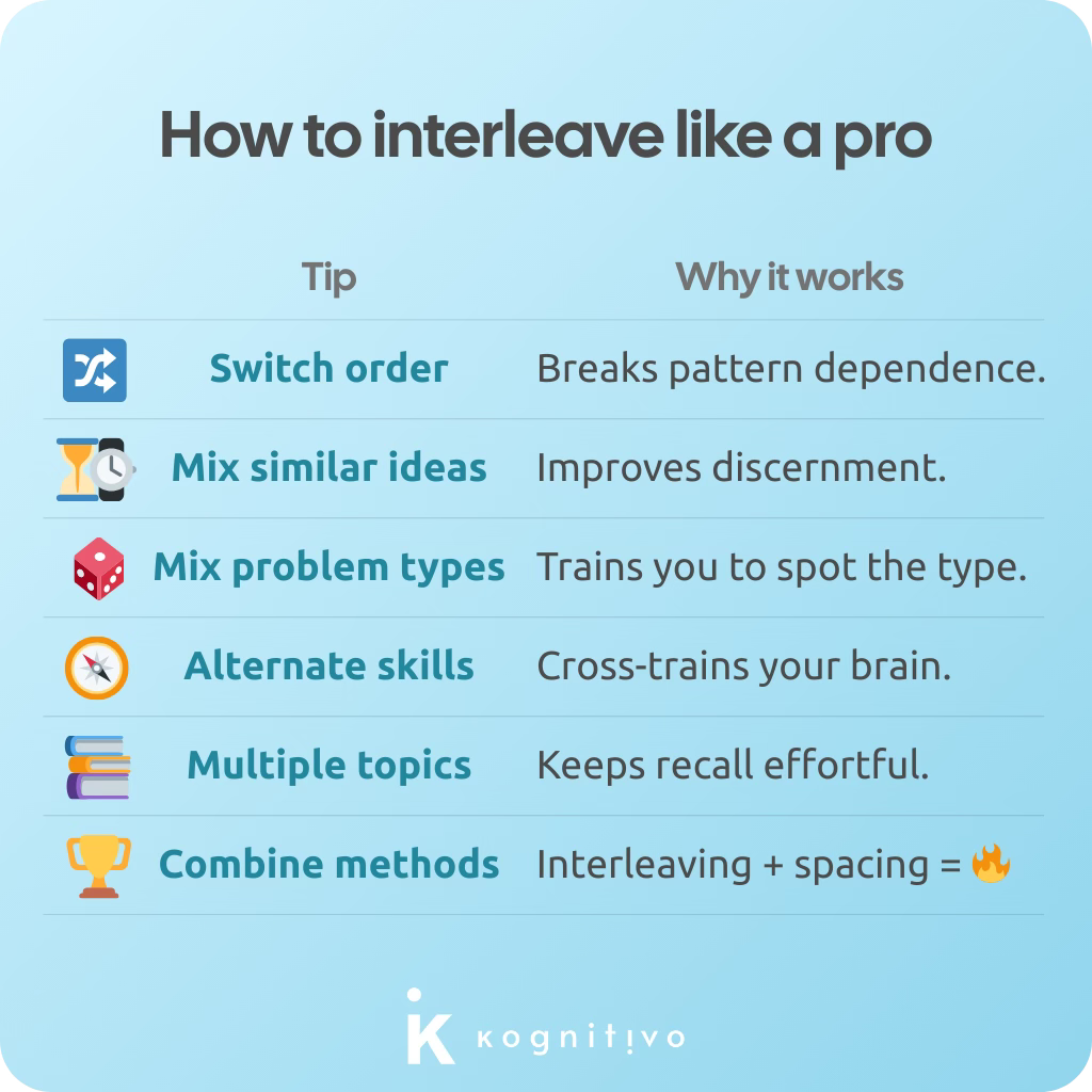 That said, interleaving isn’t only for similar concepts. It’s also powerful for building adaptability across different skill types, and yes, it even helps with encoding.