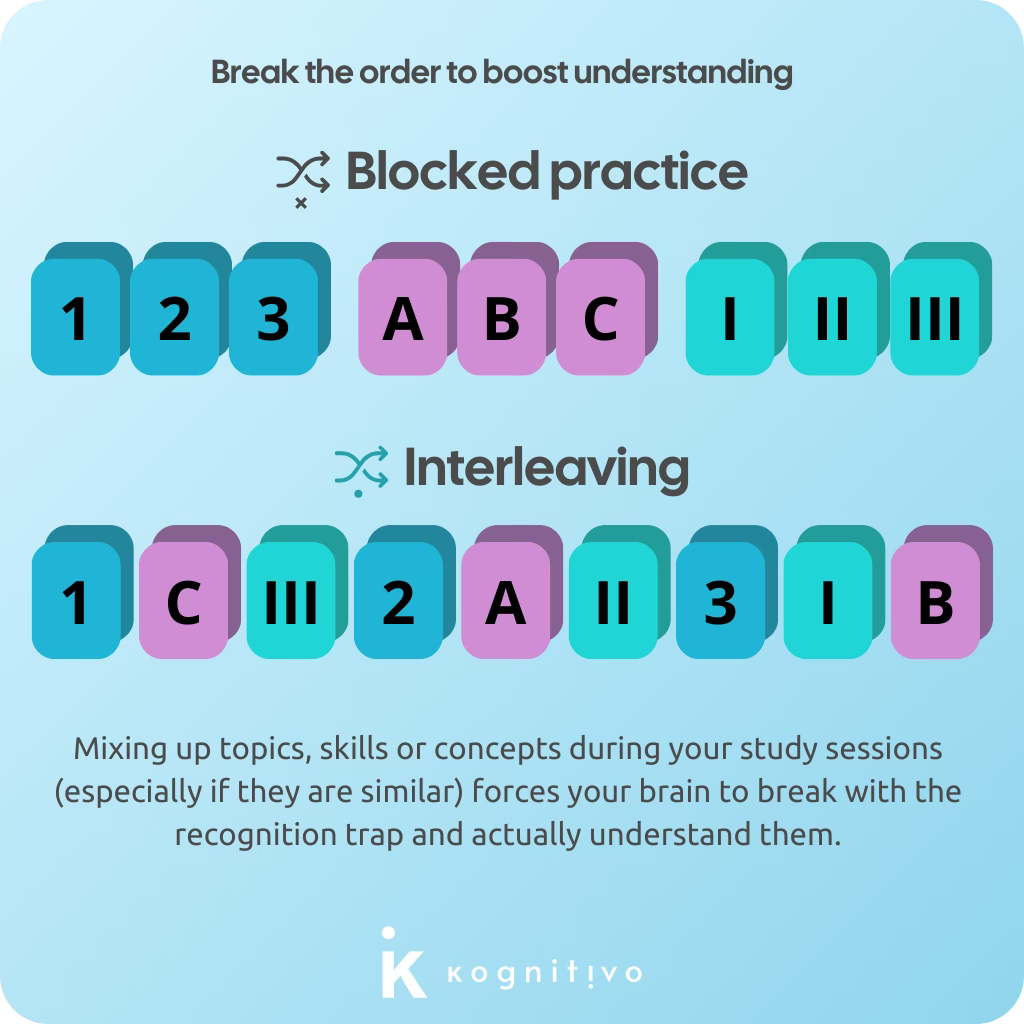 Interleaving topics while you study is proven to make your learning more efficient, because it prepares you for the unpredictability of real life.