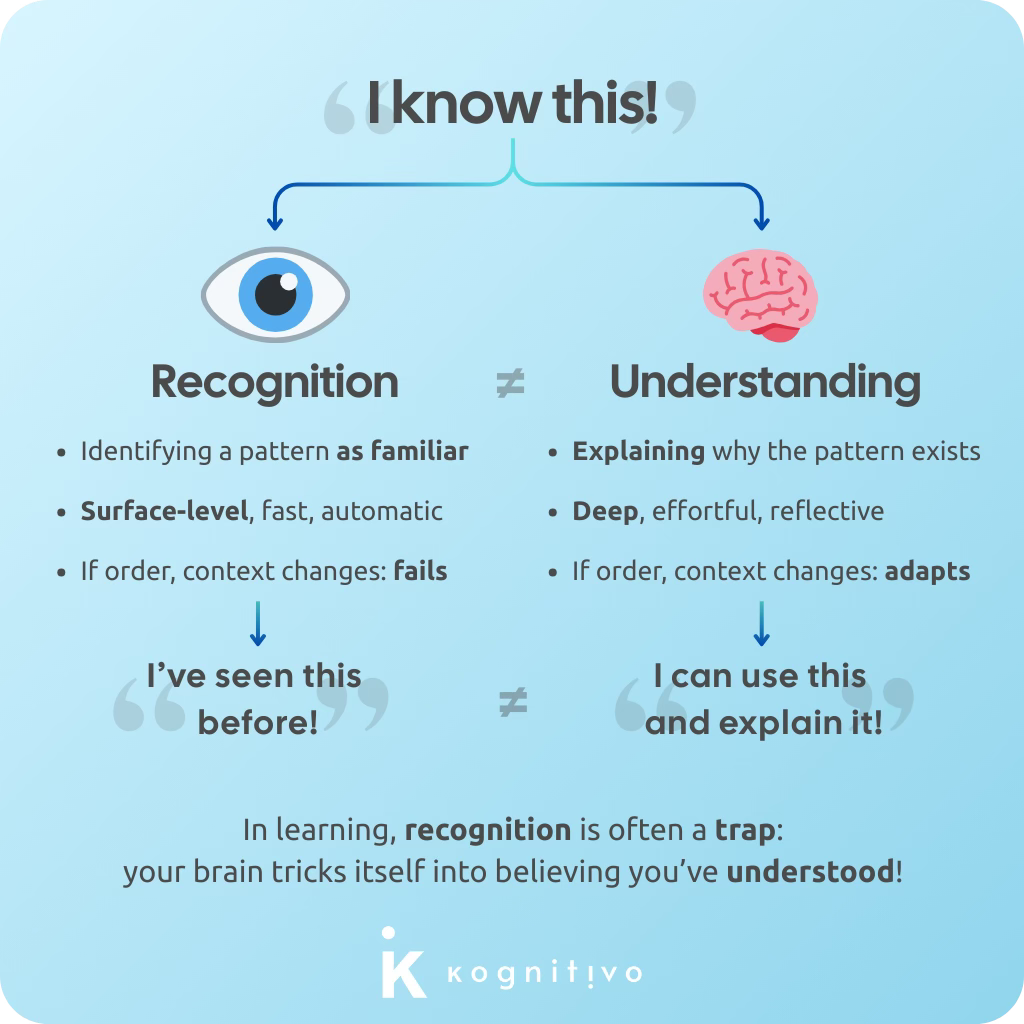 In learning, recognition is often a self-defeating trap! Our brains tend to unconsciously focus our learning around recognition instead of understanding, as a way to trick you into believing you truly mastered something.