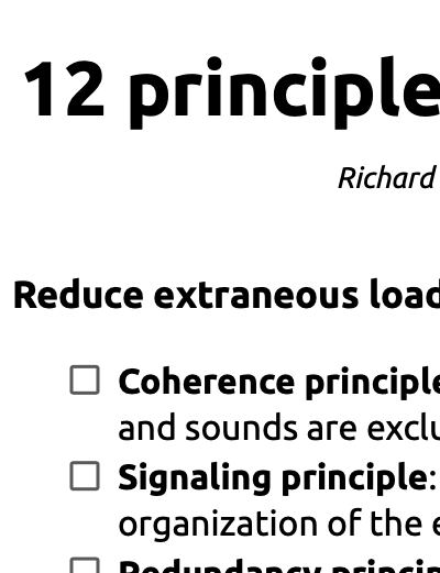 Also consider: more recent revisions of the 12 principles add additional ones: embodiment principle, generative activity principle, immersion principle, collaboration principle, etc. So the list definitely isn’t a closed one and keeps evolving as new research emerges.