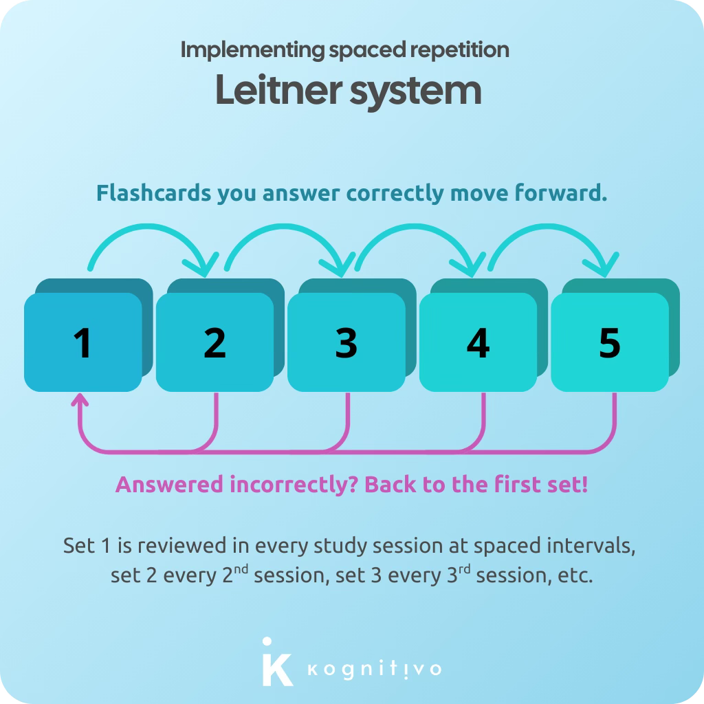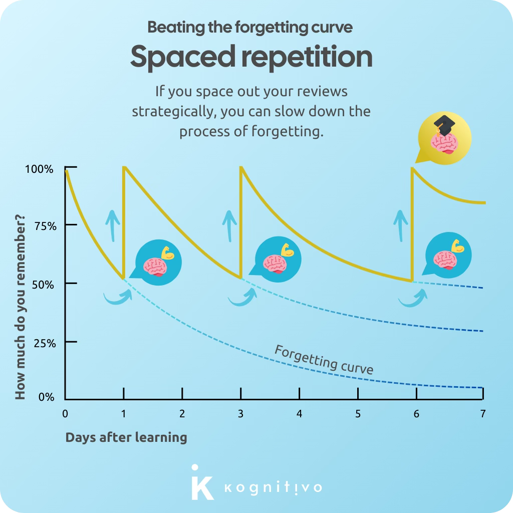 Spaced repetition is a learning technique based on strategically timed reviews. Instead of reviewing material repeatedly in a short period, you space out your reviews over increasing intervals of time.